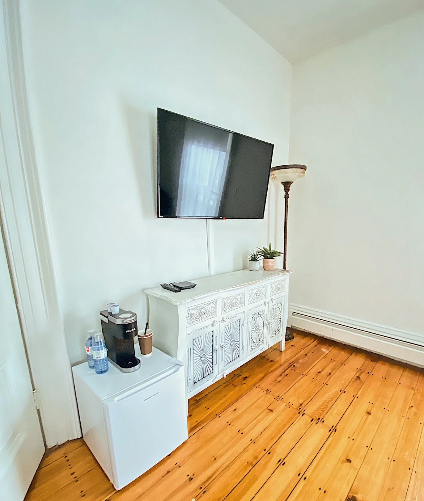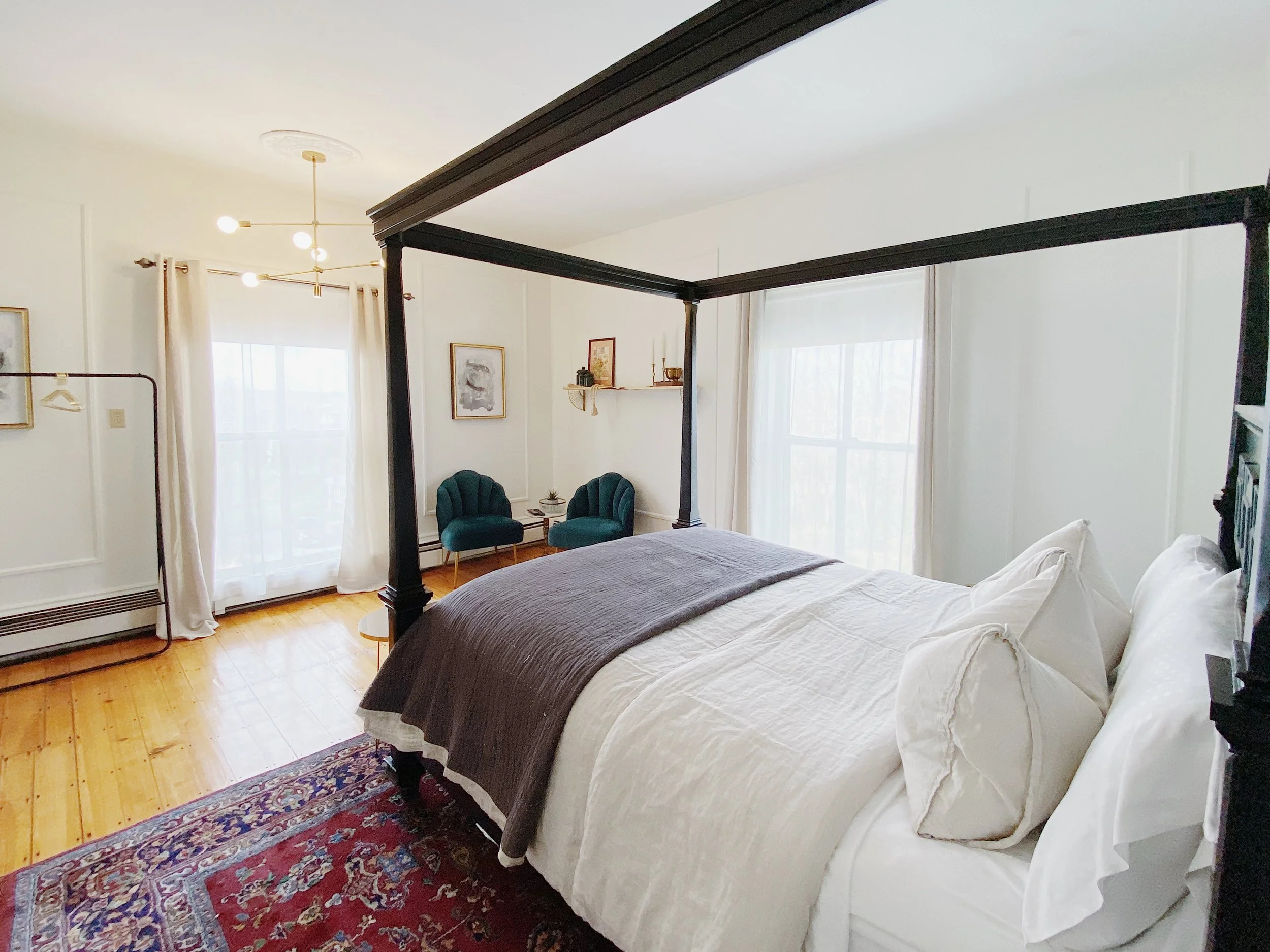 This suite has a queen sized canopy bed with a luxurious French Linen duvet cover. A 50" flat screen has a limited Rogers Ignite cable package for your viewing pleasure and can be rotated to face the seating area or bed. Modern comforts include a Keurig coffee maker with 2 coffee pods per day, a mini fridge, and a wireless charger for Apple or Samsung phones. There is a full air conditioning system.